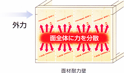 パーティクルボードは構造用面材に求められるせん断剛性(ずれ合う力に対する固さ)が、合板に比べ2倍以上。地震・台風に強い家を作ることができます。