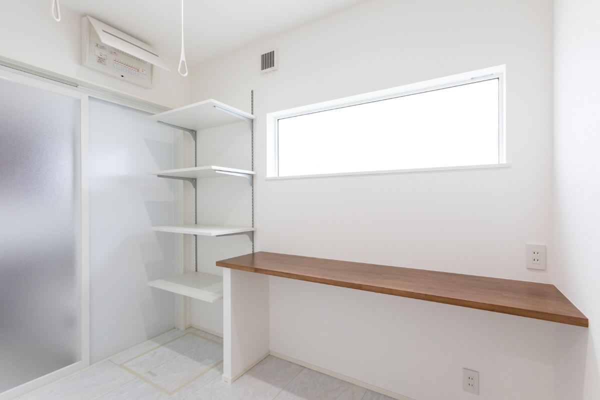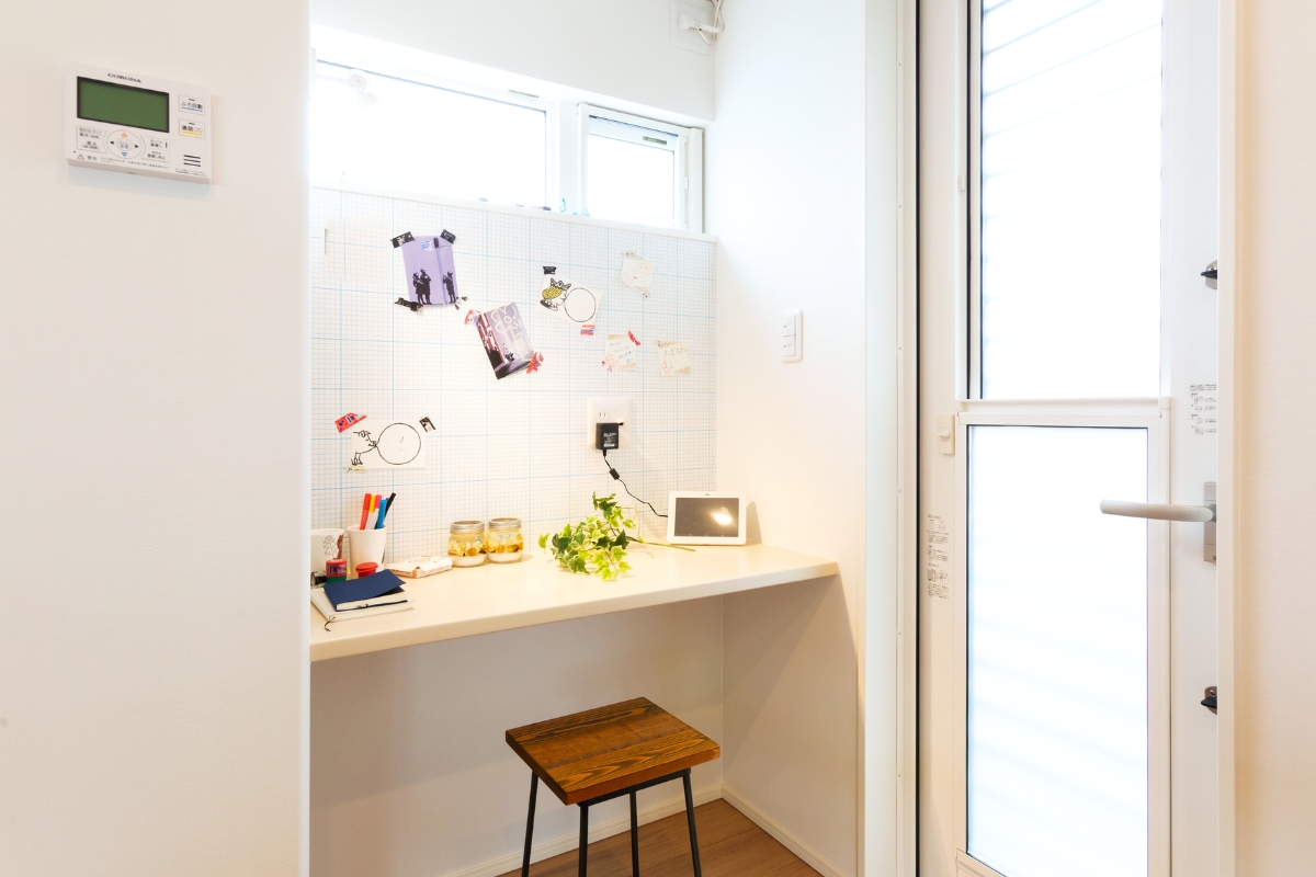 ダイニングの一角に、お子様の宿題やパソコン作業に便利なスタディカウンターを造作しました 。壁面には学校のプリントやお便りを画鋲なしで貼れるマグネットボード(Feボード)も完備 。ダイニングテーブルが散らからず、壁も傷つかない、子育て世帯に嬉しい工夫です。