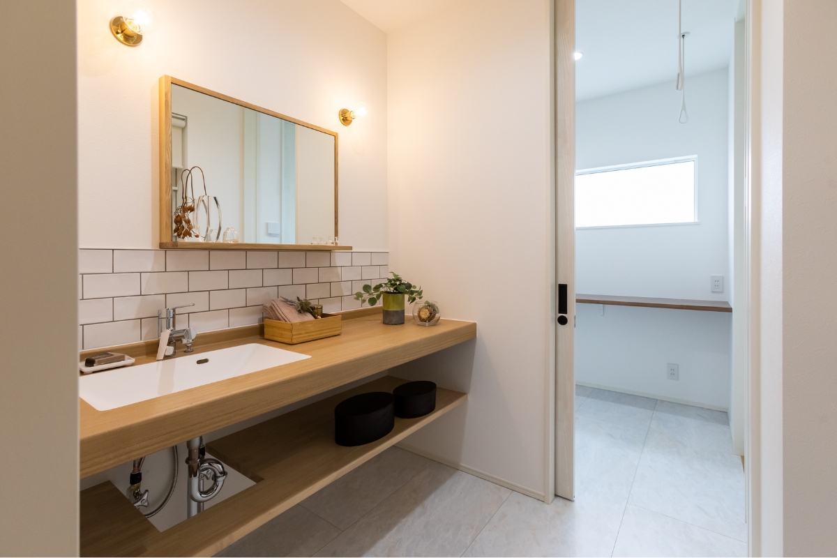「誰かがお風呂に入っていると洗面所が使えない…」そんなストレスをなくすため、洗面所と脱衣室を扉で仕切れる分離型にしました。来客時も生活感のある脱衣室を見せずに手洗いを案内できる、プライバシーと利便性を両立した設計です 。
