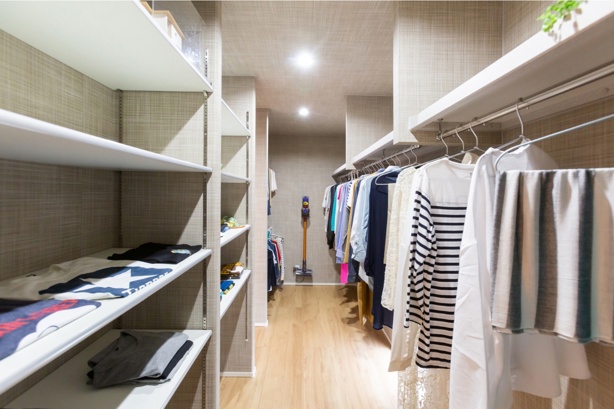1階ホールからアクセスできる場所に、家族みんなの服をしまえるウォークインクローゼットを設けました。帰宅してすぐに着替えたり、乾いた洗濯物をそのまましまったりできるため、リビングに服が散らかりません 。