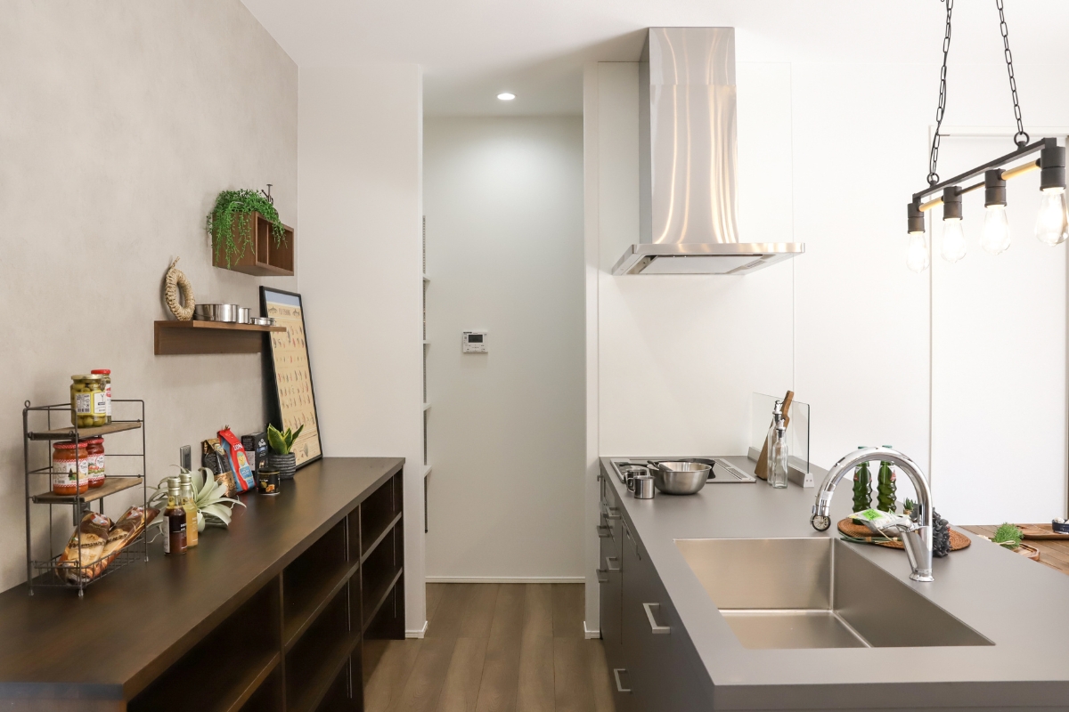 キッチンの背面には、作業スペースが広く収納力も高い「幅2740mm」の大型カップボードを採用 。家電も食器も並べて置けるゆとりの広さです。さらに横にはウォークインパントリーも配置し、ストック食材もスッキリ収納。広々としたキッチンでお料理を楽しめます 。