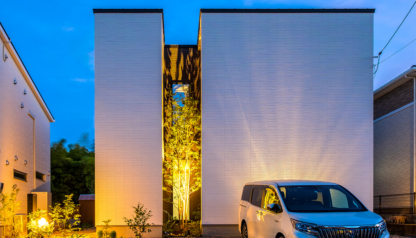 箱型の外観に統一されたエクステリア照明が、夜間に美しいアクセントを加えています。エクステリア照明は、優しく明るい光を放ち、建物の輪郭を際立たせることで、夜の外観に独特の魅力をもたらします。この照明が、家全体のシルエットを引き立てるとともに、夜間の景観を美しく演出します。