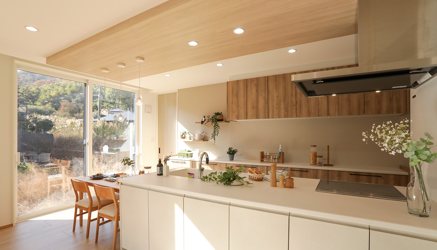 このように、下がり天井のあるキッチンは、デザイン性と機能性を兼ね備えた理想的な住まいです。家族との時間を大切にし、ゆったりとした空間で暮らしたい方におすすめです。岡山県で家づくりをお考えの方は、ぜひこの施工事例をご参考になさってください。 -