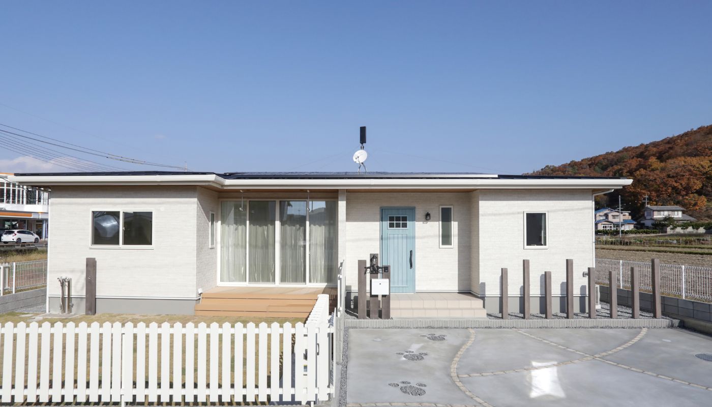 ペットと暮らす家として設計されたこの平屋は、清潔感のあるホワイトベースの外観に、爽やかな水色のドアでアクセントを加えた北欧風のデザインが特徴的です。白い外壁と水色のドアの組み合わせが、シンプルながらも印象的な外観を演出し、訪れる人々の目を引きます。