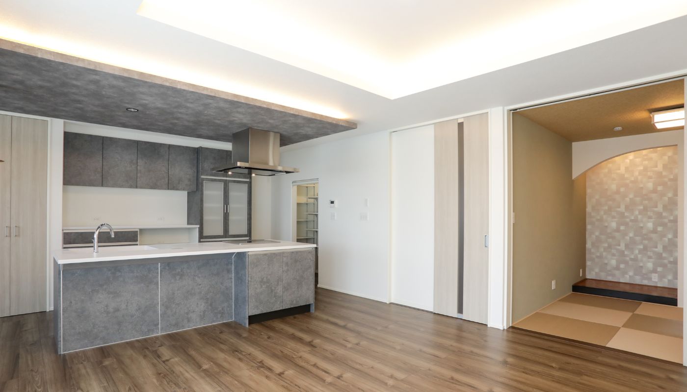 L字型のリビングには、スタイリッシュなアイランドキッチンを採用しています。アイランドキッチンは開放感を生み出し、リビングとダイニングエリアの動線をスムーズにするため、家族やゲストとのコミュニケーションがしやすくなります。キッチンでの作業がより快適で効率的に行える設計が施されています。 リビングのデザインには、グレーのアクセントクロスを施した下がり天井と、すっきりとした白いクロスの折り上げ天井が特徴です。下がり天井のグレーのアクセントクロスが落ち着いた雰囲気を醸し出し、リビング全体に洗練された印象を与えます。一方、白い折り上げ天井は空間に明るさと広がりをもたらし、開放感を演出します。 それぞれの天井には間接照明が取り入れられており、空間をゴージャスに演出しています。間接照明が天井のデザインを引き立て、落ち着きと優雅さを感じさせる雰囲気を作り出します。このように、L字型リビングは、機能性とデザイン性を兼ね備えた、美しく心地よい空間を実現しています。