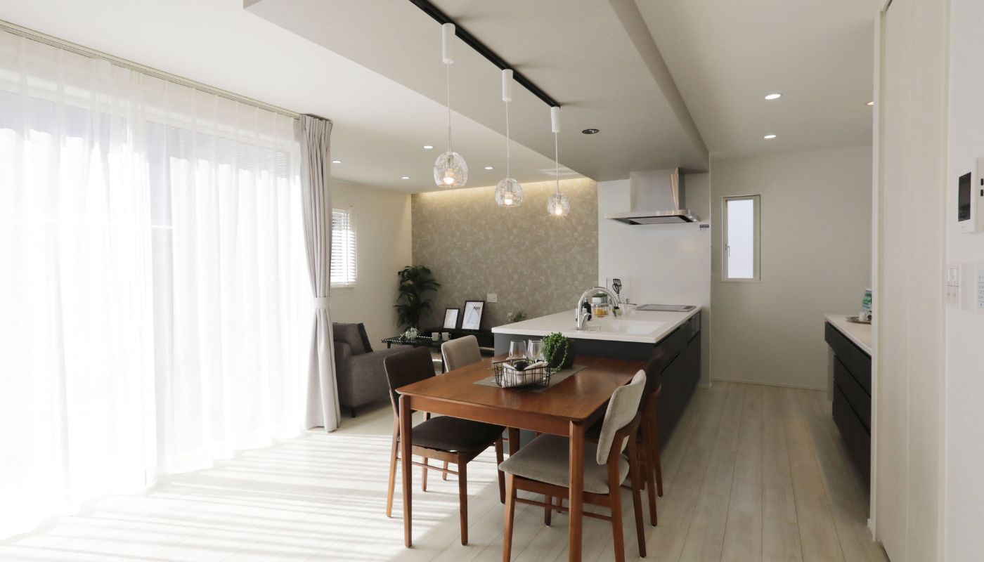 キッチンからは広々としたリビング・ダイニングを一望できる開放的な間取りになっています。お料理をしながらでも家族の様子を見守ることができ、自然とコミュニケーションが生まれます。家族との時間を大切にしたい方に最適な設計です。さらに、モノトーンで統一されたスタイリッシュな空間が、日常生活に上質さと快適さをもたらします。