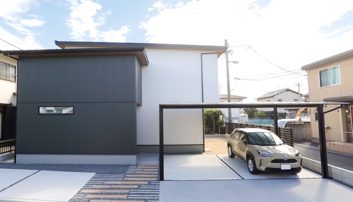 この住宅は、ホワイトの外壁をベースに、ダークグリーンのアクセントを効かせたモダンなデザインが特徴です。ホワイトの清潔感とダークグリーンの深みが、美しく調和し、スタイリッシュで落ち着いた印象を与えます。また、軒天と玄関ドアには温かみのある木目素材を使用し、自然な雰囲気を取り入れたデザインとなっています。この木目のアクセントにより、モダンさの中にもナチュラルな柔らかさを感じられる、バランスの取れた外観が魅力です。