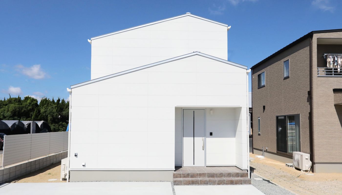 シンプルでありながら個性的なデザインが目を引きます。ホワイトを基調としたクリーンな外壁と、ずれたように配置された二つの屋根がユニークなシルエットを生み出し、洗練された印象を与えています。また、フラットな外壁と直線的なデザインが現代的でスマートな印象を強調し、周囲の景観にも溶け込みながらも存在感を放つ仕上がりとなっています。