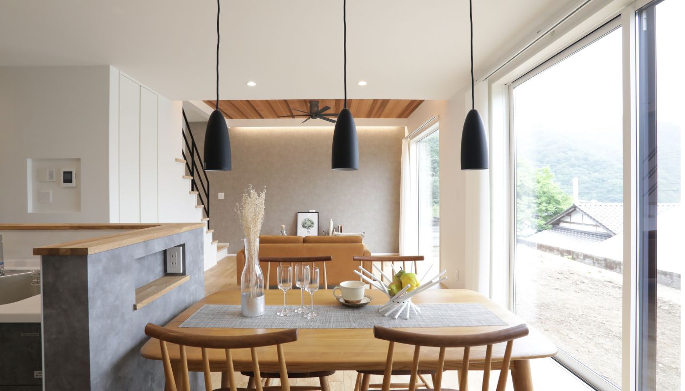 キッチンも自然の温かみを感じられるカラーチョイスでLDKを統一。ここでも照明器具のブラックが空間を引き締めています。パントリーには可動棚を採用。目隠しのロールスクリーンを取り付け、普段の生活で『扉を開ける閉める』のワンアクションを減らす工夫で家事負担を軽減しました。ダイニング側にも大きい窓を備え、とても明るく快適な空間になっています。