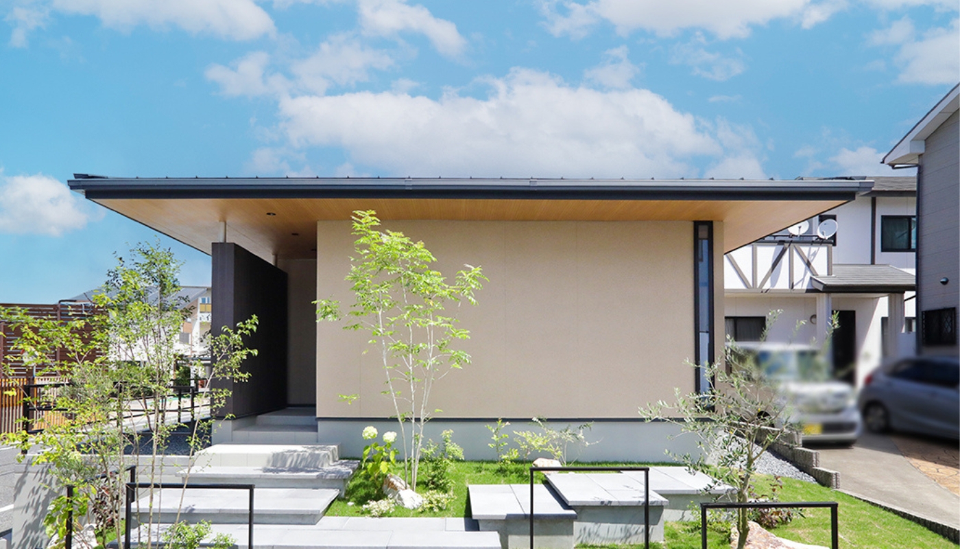 落ち着いたベージュの外壁と、すっきりとした水平ラインが美しい平屋住宅。