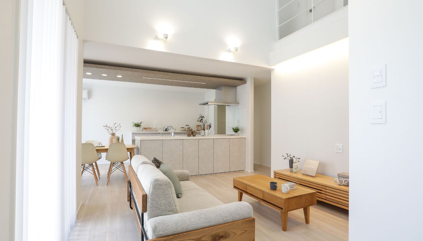 優しい色合いで統一されたLDKは、吹抜けに面した大きな窓からの光によって明るく照らされています。