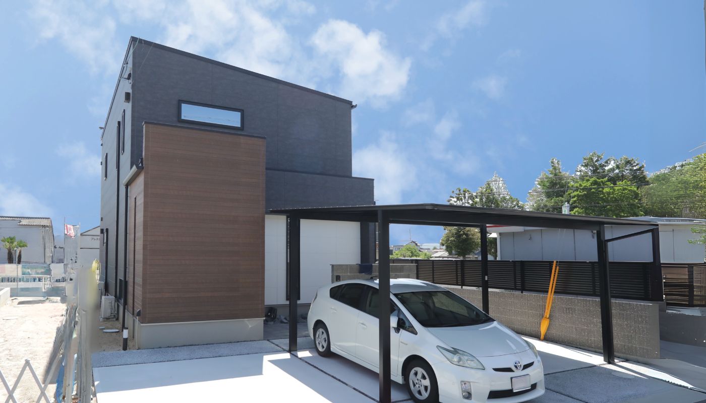 直線的でモダンなフォルムに、木のぬくもりを添えた外観は、落ち着きと上質さを兼ね備えています。カーポートや広々としたアプローチは、日々の使いやすさにも配慮された設計。郊外の静かな環境に馴染みながら、しっかりと個性を感じさせる住まいです。