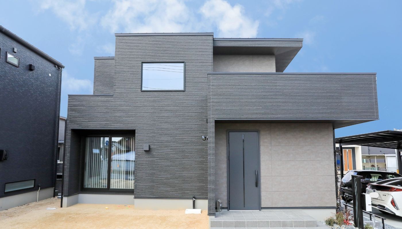 リズムのあるデザインを活かす、すっきりとしたモノトーン配色で統一感のある外観に。玄関や掃き出し窓を控えることにより、軒天が屋根の役割も担います。内外でコーディネートされたスタイリッシュなお家に仕上がっています。