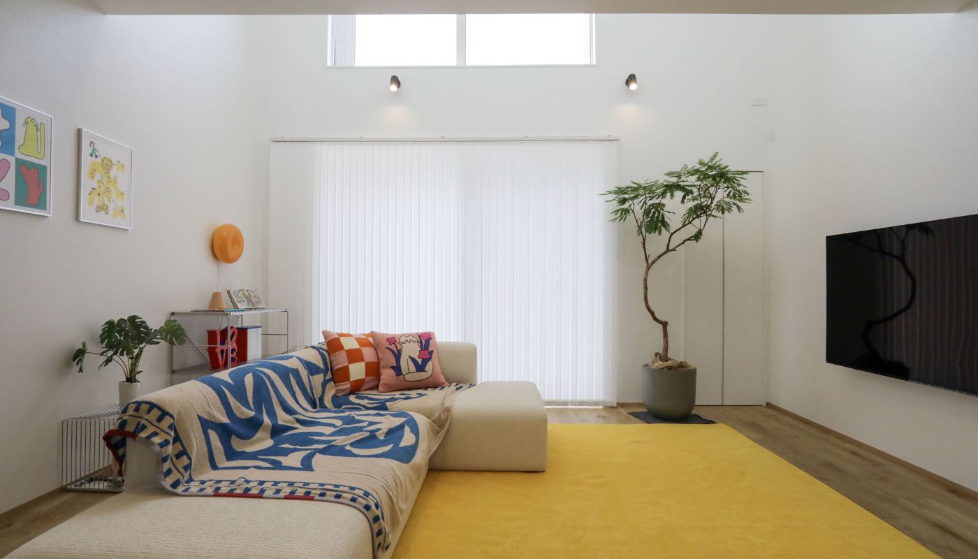 吹抜けに面した大きな上下の窓から、開放的なリビングを照らす光が差し込みます。余分な要素を排除し、無機質で明るい美術館のような空間をベースに設計しました。これにより、お施主様のセンスでコーディネートされるアートやファブリックの数々が生き生きと輝きます。日々の暮らしと共に作り上げられる、こだわりのインテリアが目を引きます。どの角度を切り取っても絵になる、自慢のリビング空間となっています。