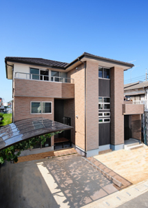 レンガ調のサイディングで全体をまとめ、アクセントの外壁や窓の位置・形で外観におしゃれをプラス。 梁を見せ、天井を高くした広々リビング。リビング横の和室は天井と畳縁を黒にまとめ、和と洋を合わせた空間に。