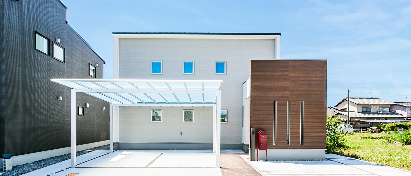窓をアクセントに無駄のないすっきりとしたフォルムの四角い外観。