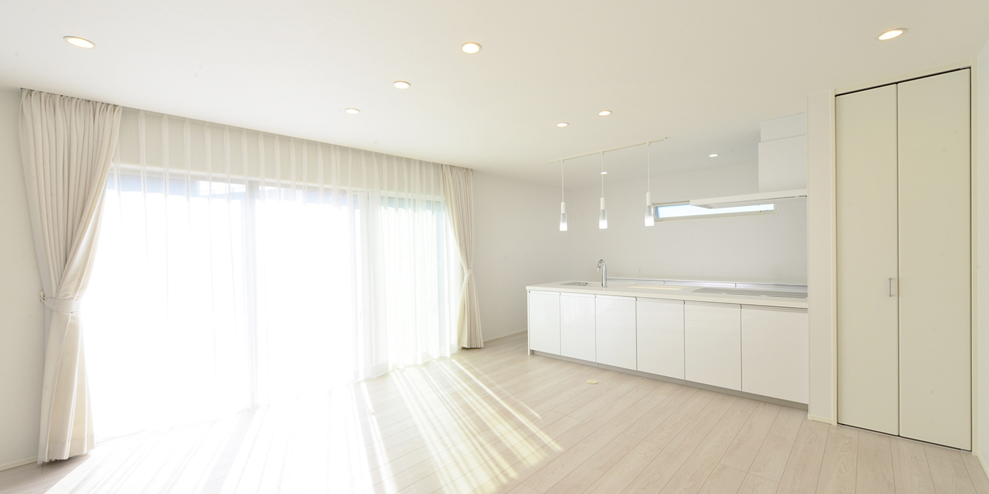 LDKは清潔感あふれる白で統一し、広々とした明るい空間になりました。白を基調としたインテリアが光を効果的に反射し、開放感と爽やかさを感じさせます。家族が集うリビング・ダイニング・キッチンは、一体感のあるレイアウトで、自然と会話が弾む心地よい場となっています。