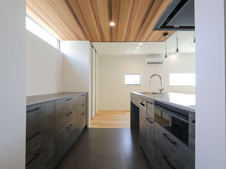 リビングには勾配天井を採用し開放感とデザイン性を両立。