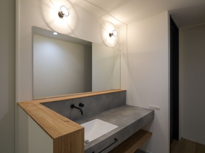 洗面とランドリースペースを隣接させ水まわりを一か所に集約した家事ラク動線。