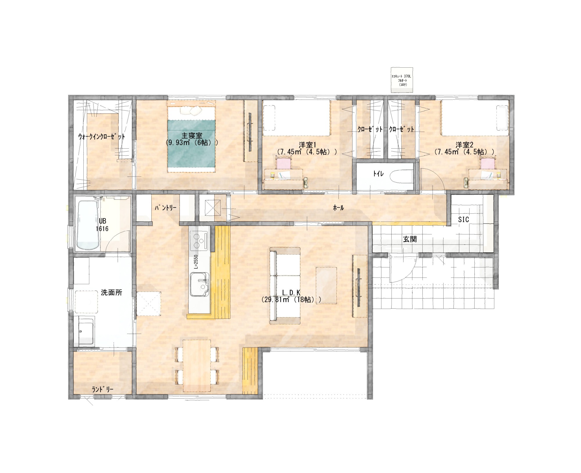 上下移動のない平屋プランで家族どこにいても声が届く、暮らしやすく安心感のある住まいが大きな魅力。