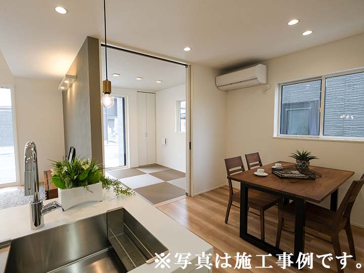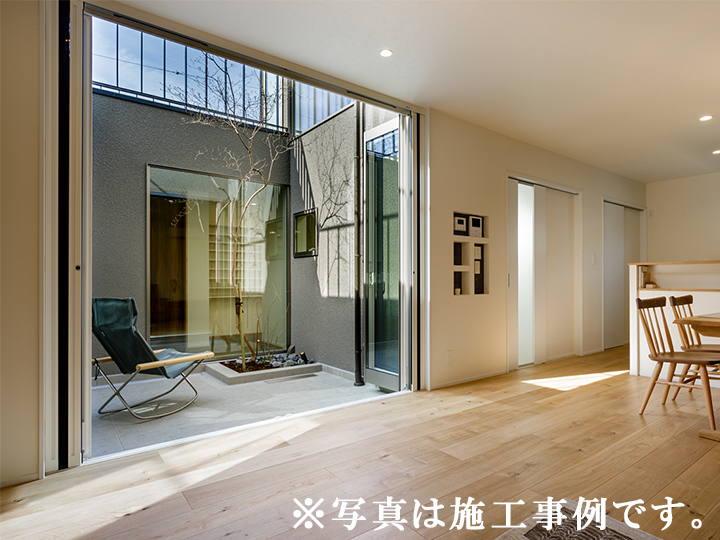 中庭とつながるリビングで光と風を満喫。外からの視線を気にせず寛げる平屋設計。家族の時間が自然と集まる。プライベート性と開放感を両立。