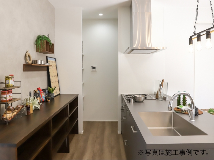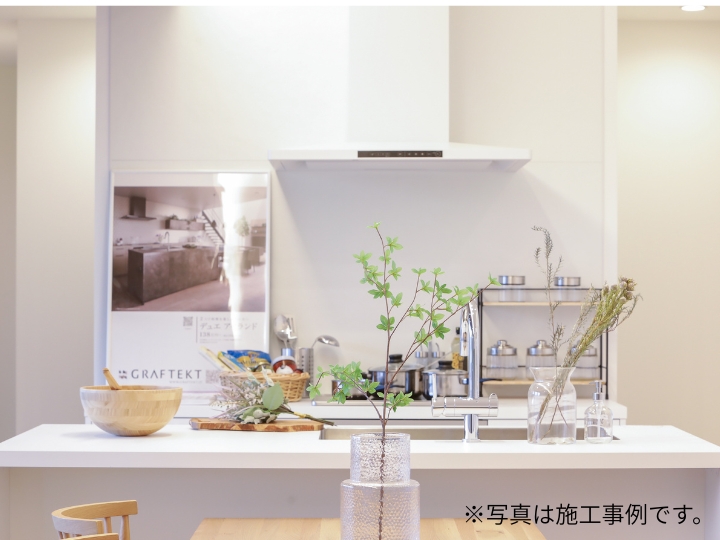 パナソニック製Ⅱ型キッチンを採用。シンクとコンロを分け、広い作業スペースと短い動線を両立。複数人でも広々と料理を楽しめる、機能的で開放的な設