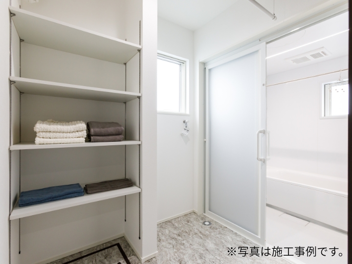 洗面室と分けた独立ランドリースペースには、室内物干しやカウンターを完備。天候を気にせず「洗う・干す・畳む」が一か所で完結します。